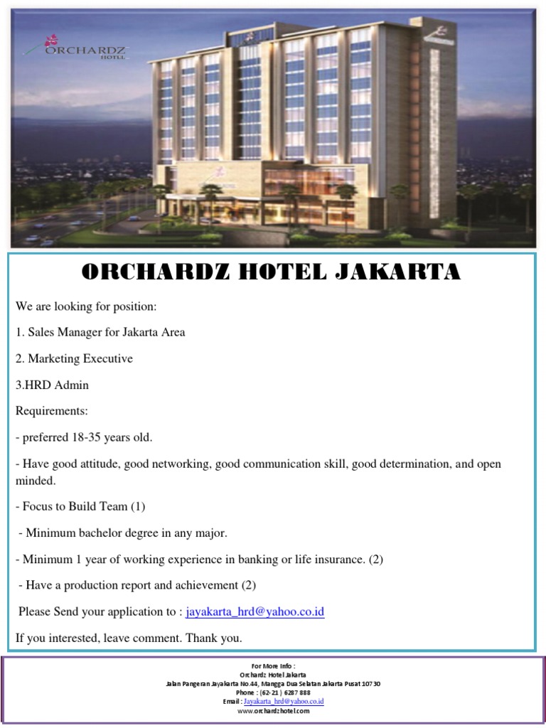 Lowongan Kerja Hotel Orchardz Jakarta. Segenap direksi, manajemen dan karyawan/ti orchardz hotel, mengucapkan selamat idul fitri 1434 lowongan kerja : Selalu perhatikan tanggal posting dan batas akhir pengiriman resume.