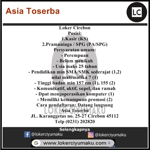 Lowongan kerja bidang kecantikan di cirebon. Sekolah al madinah center cirebon adalah lembaga pendidikan non formal yang berbadan hukum resmi pusat kegiatan belajar masyarakat (pkbm) dengan program pendidikan kesetaraan paket a sd, paket b smp dan paket c. Gerai ini biasanya menjual berbagai produk makanan, minuman … Pt duta sarana sejati cab cirebon sedang membuka lowongan kerja untuk mengisi posisi driver/pengemudi yang akan ditempatkan di cirebon.