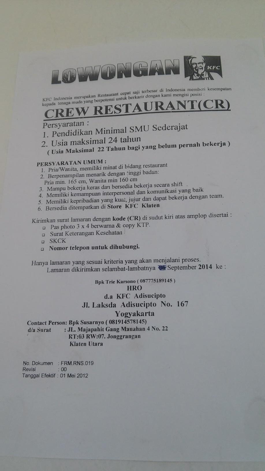 Fastfood indonesia tbk (kfc indonesia) kfc ciracas alamat : Kfc indonesia merupakan restaurant cepat saji terbesar di indonesia memberi kesempatan kepada tenaga muda yang berpotensi untuk berkarir dengan kami mengisi posisi : Lowongan kerja pt shippindo teknologi logistik (shipper). Adakarir.com | kfc atau kentucky fried chicken merupakan sebuah merek dagang waralaba dari yum!